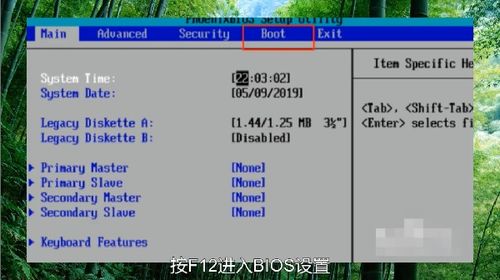 重启电脑,在开机过程中按下F12键进入BIOS设置界面。