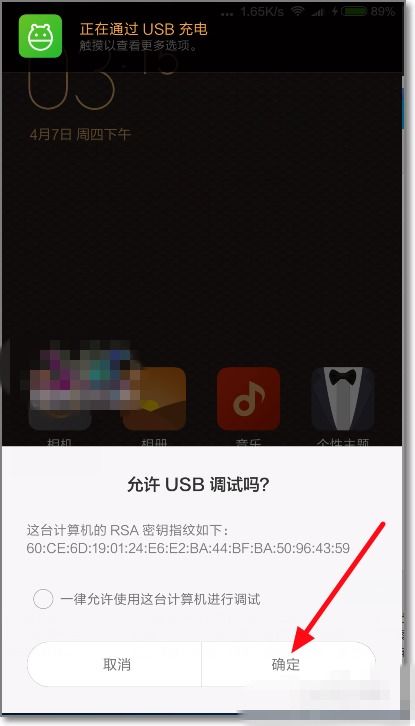 5. 手机上会弹出一个USB选项,选择【媒体设备(MTP)】,并允许USB调试。